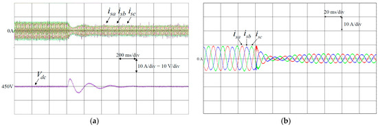 In order to verify the compensation performance and the regulation control of the DC-link voltage of the shunt APF under unbalanced load changing, two scenarios are designed as follows: (1) case 1, the load is changed from load 1 to load 3 at 0.6 s; (2) case 2, the load is changed from load 2 to load 1 at 0.6 s. First, the experimental results of PI, PFNN and the proposed PPFNN controlled shunt APF at case 1 are provided in Figure 9. The responses of the three-phase currents isa, isb, isc and DC-link voltage Vdc using PI controlled shunt APF are shown in Figure 9a. The responses of the three-phase currents isa, isb, isc using PI controlled shunt APF in 0.54–0.74 s are shown in Figure 9b. The responses of the three-phase currents isa, isb, isc and DC-link voltage Vdc using PFNN controlled shunt APF are shown in Figure 9c. The responses of the three-phase currents isa, isb, isc using PFNN controlled shunt APF in 0.54–0.74 s are shown in Figure 9d. The responses of the three-phase currents isa, isb, isc and DC-link voltage Vdc using the proposed PPFNN controlled shunt APF are shown in Figure 9e. The responses of the three-phase currents isa, isb, isc using the proposed PPFNN controlled shunt APF in 0.54–0.74 s are shown in Figure 9f. From the experimental results, the proposed PPFNN controlled shunt APF can reduce the transient and steady-state error of the DC-link voltage more rapidly as shown in Figure 9e. Comparing with PI and PFNN controllers, since the proposed PPFNN controller owns fast convergence capability with robust, the excellent regulation control of the DC-link voltage and the compensation performance can be obtained by the proposed PPFNN controlled shunt APF. Moreover, the experimental results of PI, PFNN and the proposed PPFNN controlled shunt APF at case 2 are provided in Figure 10. The responses of the three-phase currents isa, isb, isc and DC-link voltage Vdc using PI controlled shunt APF are shown in Figure 10a. The responses of the three-phase currents isa, isb, isc using PI controlled shunt APF in 0.54–0.74 s are shown in Figure 10b. The responses of the three-phase currents isa, isb, isc and DC-link voltage Vdc using PFNN controlled shunt APF are shown in Figure 10c. The responses of the three-phase currents isa, isb, isc using PFNN controlled shunt APF in 0.54–0.74 s are shown in Figure 10d. The responses of the three-phase currents isa, isb, isc and DC-link voltage Vdc using the proposed PPFNN controlled shunt APF are shown in Figure 10e. The responses of the three-phase currents isa, isb, isc using the proposed PPFNN controlled shunt APF in 0.54–0.74 s are shown in Figure 10f. From the experimental results, the transient and steady-state responses of the DC-link voltage are also much improved as shown in Figure 10e due to the powerful adaptive ability of the proposed PPFNN controlled shunt APF. Finally, a numerical performance comparison of the proposed PPFNN with PI and PFNN controllers is provided in Table 2. The response time from the transient state to steady state of the DC-link voltage and the maximum DC-link voltage error from overshoot to undershoot in transient state using PI, PFNN and the proposed PPFNN controllers at cases 1 and 2 are shown in Table 2. From Table 2, the proposed PPFNN controlled shunt APF owns fast response time and less overshoot and undershoot. Therefore, the proposed PPFNN controlled shunt APF possesses excellent compensation and regulation performance.