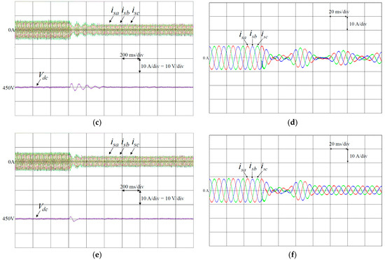 Experimental results at case 1: (a) Responses of three-phase currents isa, isb, isc and regulation control of DC-link voltage using PI controlled shunt APF; (b) Responses of three-phase currents isa, isb, isc using PI controlled shunt APF in 0.54–0.74 s; (c) Responses of three-phase currents isa, isb, isc and regulation control of DC-link voltage using PFNN controlled shunt APF; (d) Responses of three-phase currents isa, isb, isc using PFNN controlled shunt APF in 0.54–0.74 s; (e) Responses of three-phase currents isa, isb, isc and regulation control of DC-link voltage using proposed PPFNN controlled shunt APF (f) Responses of three-phase currents isa, isb, isc using proposed PPFNN controlled shunt APF in 0.54–0.74 s.