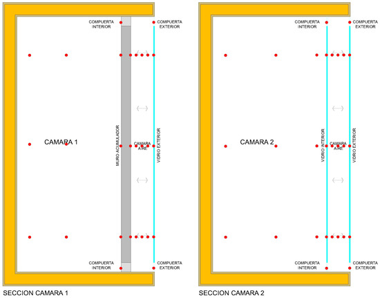 Sensor system. The SECCIÓN CAMARA (section or the room 1, on the left and 2, on the right) shows the section of the two rooms with the location of the sensor systems, i.e., red dots.
