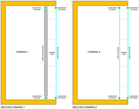 Distribution of the anemometers. The SECCIÓN CAMARA (section or room 1, on the left and 2, on the right) shows the section of the two rooms with the location of the anemometers, i.e., green dots.