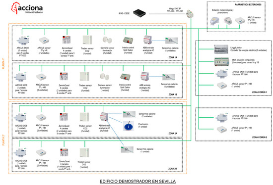 General schema of the installation in the Seville building. One can see the first roof (1A) and the second floor (2A), and the different installations used to control the building.