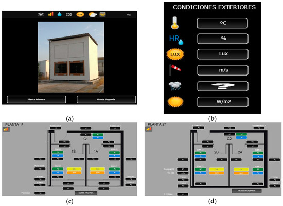 System monitoring via the web. On top, the access screen is shown, which allows us to select the first or the second prototype. Once a prototype is selected, one can select the different measurements (temperature, radiation, etc.). On the bottom right is the monitoring distribution for the two floors. (a) Acces screen; (b) External conditions; (c) First floor; (d) Second floor.