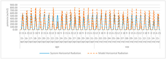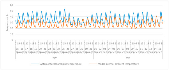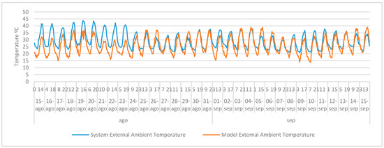 The first thing to be considered, for a correct comparison of results, is boundary conditions, temperature, humidity, etc. In this case, temperature and solar radiation data for the period studied were consulted. Figure 9 shows the comparison between the exterior temperature for the model and for the system. We can see that, although both charts follow the same pattern, a difference in the magnitude is clear in the first few days. The deviation regarding the mean minimum temperatures of the model implies a higher daily thermal jump in the model data, compared with the system data. A detailed analysis also allows us to detect that until 21 August, the temperatures in the system were very high (compared to those obtained from the model), we discuss this later in the statistical analysis.