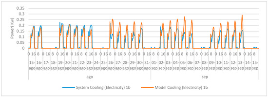 Another interesting element to consider is the acclimatization system. In Figure 11 the behavior of the cooling acclimatization system (analyzing the kW) for the model and the system is represented. It can be seen that in the first 7 days there is a remarkable coincidence of power consumption between model and system. In the next three weeks, these values indicate a greater difference. It would be interesting to perform a study across the values of other variables, over the same period, to determine whether there is any explanation for this divergence.