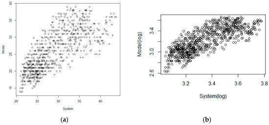 Plot between System and Model time series for the exterior temperature, (a) depicts the relation between the system and the model temperatures, (b) the data with a logarithmic transformation.