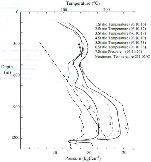The Yangbajing geothermal field is located in the Yangbajing district in Dangxiong county, 94 km northwest of Lhasa, the capital of the Tibet Autonomous Region, China. Its geographic coordinate ranges from 30°01′ N to 30°05′ N and 90°27′ E to 90°31′ E, with elevation ranging from 4290 m to 4500 m above sea level []. It is the first high-temperature hydrothermal convective geothermal field in China [,,]. Reference [] reported the geologic structure, hydrological and geothermal features of the Yangbajing geothermal field in detail. In the northern part, well ZK4001 was drilled to 1450 m, and well ZK4002 was drilled to 2006.8 m; both are exploration wells for a deep heat reservoir [,,]. Figure 1 shows the temperature and pressure logs from well ZK4001 []. There are two heat reservoirs in well ZK4001: the 240~450 m depth reservoir and the 950~1350 m depth reservoir. The 240~450 m reservoir is a shallow heat reservoir, mainly fractured granite, with an average temperature of 157 °C; it is the main reservoir currently exploited and its cap rock is mainly Tertiary volcanic clastic rock. The 950~1350 m reservoir is deep heat reservoir (at a depth of 785~1010 m in the well ZK4002) []; this deep reservoir is located within mylonitized granite, granitic mylonite and fractured granite that have characteristics of both ductile and brittle shearing, and is covered by intensely altered and impermeable granite, haplophyre and biotite-granite []. The average temperature of the 950~1350 m reservoir is 248 °C with a maximum temperature of 251 °C []. The corresponding pressure is within 8.01~11.57 MPa in the 950~1350 m reservoir. This pressure range is computed according to the relationship between pressure P (MPa) and depth z (m) as , which is also indicated in []. More information about the Yangbajing geothermal field can been found in reference [,,,,,,].