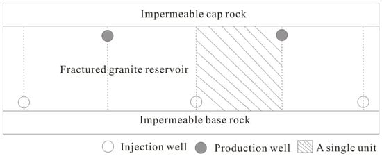 The cap rock and base rock of the 950~1350 m fractured granite reservoir at the Yangbajing geothermal field has only very slight permeability [,,,,], and the cap rock and the base rock can be assumed to be impermeable, as shown as in Figure 2. Because there is only very slight conductive heat transfer between the permeable reservoir and the impermeable cap and base rock, this conductive heat transfer can be neglected [,,,,]. As shown in Figure 3, after these simplifications are implemented, the simulated domain is within 0~500 m in the x direction, and is within −1350~−950 m in the z direction. Because the thickness of the simulated domain is only 10 m, the simulated domain is within 0~10 m in the y direction. Previous studies have proved that neglecting the slight water flow and heat transfer in the impermeable cap rock and base rock are reasonable and can greatly simplify the simulation problem [].