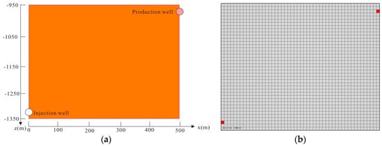 Figure 3a shows geometric model of the above simulated domain, and Figure 3b shows grid system for domain discretization. In this study we used structured grids. The simulated domain is uniformly divided into 50 gridblocks along the x direction, and width of every gridblock is 10 m. It is uniformly divided into 40 gridblocks along the z direction and height of every gridblock is 10 m. There is only one gridblock along the y direction and width of this gridblock is 10 m. Therefore the whole two dimensional system in Figure 3b comprises 50 × 40 = 2000 gridblocks. Because the radius of the horizontal well is only rw = 0.10 m, far less than the size of the gridblock, the well is represented by the gridblock in which the well is located in the form of the source term. Similar to previous studies [,,,,,,], in this study we employed the EPM method to represent the fractured granite reservoir, and the properties and conditions of the simulated domain of the 950~1350 m reservoir are shown in Table 3, in which the reservoir porosity (φ), reservoir permeability (k), rock heat conductivity (λ), water production rate (q) and injection temperature (Tinj) in each case are listed in Table 2.