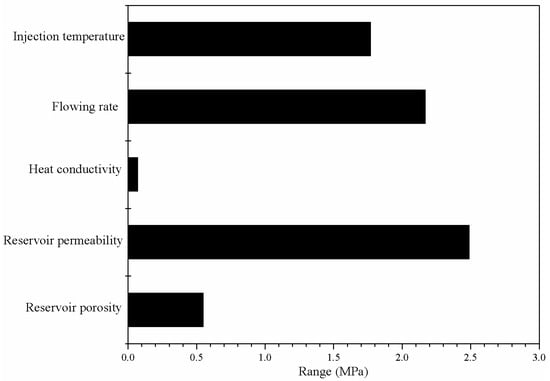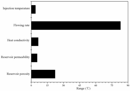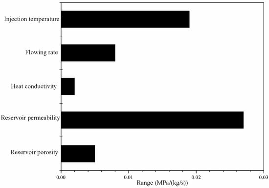 Table 7 shows the mean effects of different levels of geologic conditions on the injection pressure at t = 20 years and ranges of the five conditions, and Figure 6 shows the ranking of the five conditions of the influential effects on the injection pressure. Table 7 and Figure 6 show that, for the injection pressure, the order of significance levels of the geological conditions is as follows: k > q > Tinj > φ > λ. This proves that higher permeability or more appropriate water production rate or more appropriate injection temperature can effectively reduce the injection pressure and greatly increase the safety. This is in good agreement with previous sensitivity analysis from Zeng et al. [].