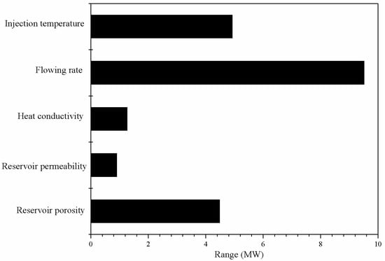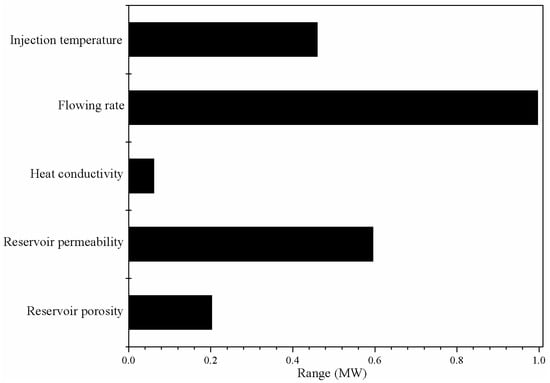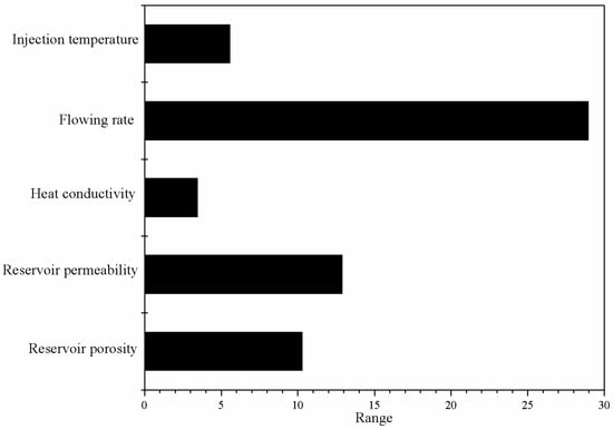 Table 6 shows mean effects of different levels of geologic conditions on the electric power at t = 20 years and ranges of the five conditions, and Figure 5 shows ranking of the five conditions of the influential effects on the electric power. Table 6 and Figure 5 show that, for the electric power, the order of significance levels of the geological conditions is as follows: q > Tinj > φ > λ > k. It can be found that the most important conditions affecting the electric power are the q and the Tinj, and this is in very good agreement with previous sensitivity analysis from Zeng et al. []. Based on Equation (1), the electric power is directly proportional to q. Appropriate q will increase the production temperature and generation efficiency and thus improve the electric power. Overall, the determination of q must be based on comprehensive consideration of the production temperature and the electric power.