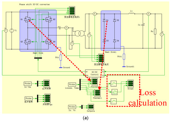 The PLECS loss simulation model, (a) the model of the DC/DC converter, (b) the model of the three-phase inverter.