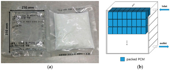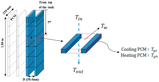 The specifications and appearance of the cooling and heating PCM packs are presented in Table 1 and Figure 2a. PCMs are organic n-tetradecane packed with polymer films in a rectangular shape. The cooling and heating PCMs have about 2 °C of transition temperature difference, however, constant phase temperatures are assumed as average temperatures of 4 °C and 52 °C for cooling and heating PCMs, respectively [23]. One pack weighs 1 kg, and measures 250 mm × 310 mm × 17.3 mm. As demonstrated in Figure 2b, The PCM packs are stacked to fill the interior of the thermal storage tank: six layers in height, eight layers in depth, and 28 layers in width. Thus, a total of 1344 packs of heating and cooling PCMs are used. As shown in Figure 2 and Figure 3, the packs are fixed vertically, preventing them from tilting and allowing efficient heat transfer during phase change [24]. Water flows inside pack spacing of 38.4 mm from top to bottom.