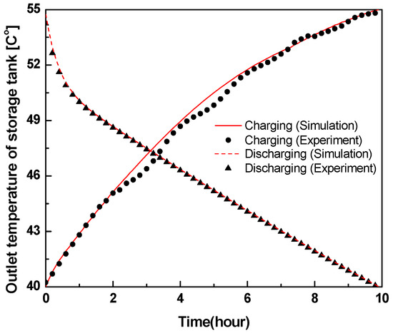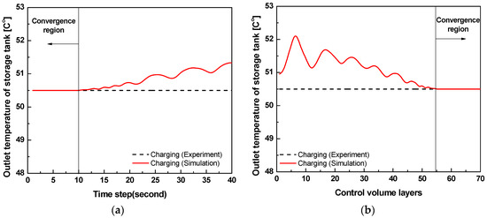 A numerical analysis was performed with respect to the developed model of the thermal storage tank, using a MATLAB program [26]. A series of experiments were conducted on charge and discharge performance in a dual new latent heat storage tank with similar features to previous studies [27], and the outlet temperatures of the storage tank are shown in Figure 4. The experiments and simulations were performed for approximately 10 h. The operating conditions of the thermal storage tank are determined in accordance with midnight-electricity equipment technical specifications by Korea Electric Power Corporation (KEPCO) [5]. The initial interior temperature of the storage tank during the charge process was 40 °C, while the inlet water temperature was 55 °C. It was assumed that the charge process terminated when the outlet temperature of the storage tank reached 55 °C. Subsequently, the discharge process started with an inlet water temperature of 40 °C. When the outlet temperature of the storage tank reached 40 °C, the discharge process was completed. The forward difference method is used to simulate numerical models. Figure 5 shows the result of temperature estimation according to the time interval and the number of control volume in height at the moment of 5 h during charging process. The time interval is selected as 6 s and the thermal storage tank is divided into 60 control volumes in height [28]. Simulation models well predicted the outlet temperature of the thermal storage tank in the experiments, and the amount of heat charged and discharged coincided with that summarized in Table 2.
