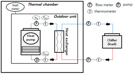 The heat pump used in this study was an air-cooled type using R407C as refrigerant. The aim of the performance experiment was to develop a numerical model for performance characteristics of the heat pump [29,30]. The performance experiment setup is shown in Figure 6.