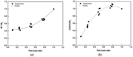 PLR (Part load ratio) of a heat pump is defined as the ratio of the actual heating capacity to the heating capacity at full-load condition, as expressed in Equation (16). Since a heat pump operates in accordance with variable loads of the building, it operates mostly on part load conditions. Under part load conditions, power consumption of the heat pump can be predicted from power consumption at full load and the correction factor for part load operation () is defined by Equation (17).