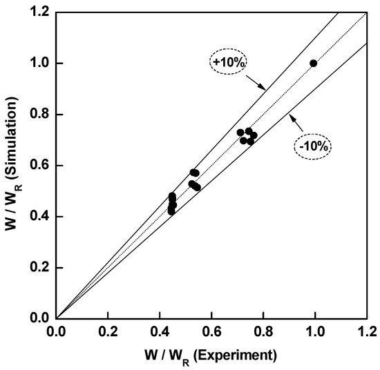 The power consumption of the heat pump can be predicted by using the developed heat pump model per the following method. The full-load heating capacity and full-load power consumption of the heat pump, using the outlet temperature and outdoor temperature, are obtained from Equations (14) and (15). The PLR can be calculated from Equation (16) using heating capacity in response to the required heating load. The correction factor for part load power consumption is yielded from Equation (18). The predicted power consumption of the heat pump under given operating conditions and actual heating capacity can be calculated from Equation (17) by multiplying the correction factor by full-load power consumption. Figure 8 presents a comparison of experimental power consumption with values predicted by the heat pump model. It shows that the heat pump model predicts values within an error range of ±10%.