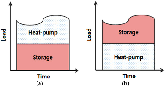 Conceptual diagram of conventional control methods: (a) thermal storage priority method; and (b) heat pump priority method.