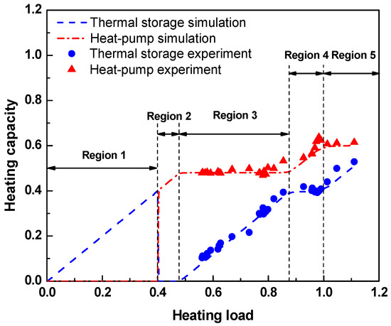 In Region 1, the thermal storage tank alone processes the load until heating load reaches reference cooling capacity. In Region 2, only the heat pump operates until the heating load is equal to optimum capacity of heat pump. In Region 3, heat pump operation is fixed at the optimum heating capacity, while the thermal storage tank handles the rest of the load. In Region 4, the thermal storage tank maintains the reference heating capacity. The rest is disposed of by the heat pump operating at a capacity between about 0.48 and 0.6, which are optimum and full-load heating capacities of the heat pump, respectively. Finally, in Region 5, the heat pump operates at full load as the load increases, and the thermal storage tank increases discharge rate to handle the rest.