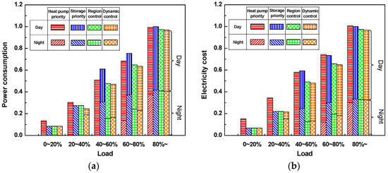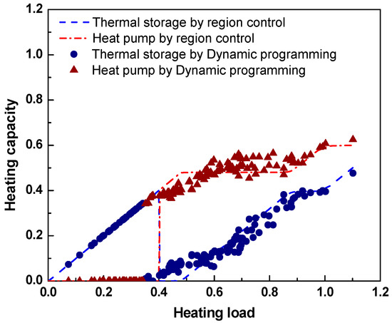 Figure 14b indicates the simulation results for control methods based on the heating load throughout winter. When the heat pump priority method is used, the heat pump handles entire heating load when it is 60% or less. When it exceeds 60%, the thermal storage tank increases heating capacity to handle the load, as the heat pump cannot increase its capacity any further. In the thermal storage priority method, heating capacity of thermal storage is fixed at 0.4 when the load is 40% or more; otherwise, entire heating load is handled by the thermal storage tank. The region control method shows a pattern similar to that of the thermal storage priority method when the heating load is 40% or less. When the load exceeds 40%, the heat pump does operate, but with a capacity lower than that of the heat pump priority method where the heat pump operates at full capacity. As indicated in Figure 12, the heat pump is operated at optimal PLR for heating load of 0.48–0.88, distinguishing this method from the heat pump priority method with a full-load heat pump. In the dynamic programming method, the thermal storage tank handles most of the load when it is less than 40%. For load over 40%, heating capacity of the heat pump becomes larger than that of the thermal storage tank. Unlike the region control method, the dynamic programming method does not divide the control area with respect to load size, but follows the minimum cost path. Nevertheless, Figure 13 shows similar patterns arising from the two methods.