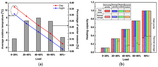 Analysis of heating load and heating capacity: (a) percentage of winter season and average outdoor temperature by each heating load; and (b) heating capacity rate due to normalized loads with over 80% load.