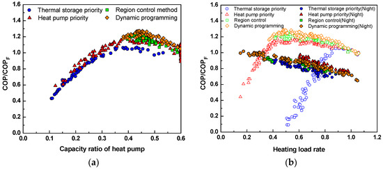 Performance analysis by control method: (a) the normalized COP by control mode according to capacity ratio of heat pump; and (b) the normalized COP by control mode according to heating load rate.