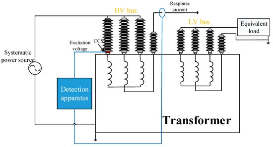 A simple diagram of the online IFRA method is depicted in Figure 1. The transformer is in service, with the systematic power source energized in the HV side and the load in the LV side. The controllable high voltage nanosecond pulses are injected into the terminal of the transformer winding by using a CCS, which is a metal strip that is wrapped around the bushing external insulation layer. Particularly, CCS functions as a medium to couple the nanosecond pulse voltage into the winding terminal. The usage of CCS has erased the low frequency data of online IFRA signature, and this effect can be found in [20,25]. The impact of CCS on bushing external insulation can be discovered in [26]. More detailed information about the diagnostic system and the practical application can be found in [19,27].