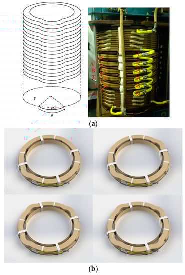 The image of the winding RD fault is shown in Figure 3. In Figure 3a, d represents the amount of RD which is a variable, θ represents the angle which is fixed at 45°, the ratio of d and the winding radius r are set to be 5%, 7% and 10% to emulate the different degree of RDs produced at one direction. There are also other RD fault windings in which the faults are manufactured at different directions, but the ratio of d and r is fixed at 5%, as shown in Figure 3b.