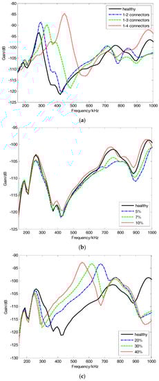 Fifteen groups of DSV fault were emulated. The detailed experimental setup is shown in Table 3 in which the connectors 1~4 have the same meaning as those in Table 1, for simulating different fault locations. As for the degree, the numerical value indicates the percentage of the paralleled capacitance to the capacitance of the adjacent healthy disk, in which the capacitance of the adjacent healthy disk is calculated to be approximately 2 nF based on the finite element method. Cases of online IFRA signatures under simulated DSV faults are shown in Figure 4c, in which the degrees of 20%, 30% and 40%, corresponding to the capacitances of 400 pF, 600 pF and 800 pF, are paralleled with the third and fourth connector of the middle sequential twisted disks. Compared with the healthy signature, the faulty IFRA signature changes notably beyond 250 kHz. The signature shifts toward the low frequency band, which shows a significant difference from the effect of inter-disk SC fault. Furthermore, as the fault level increases, the variation of faulty signature becomes more remarkable.