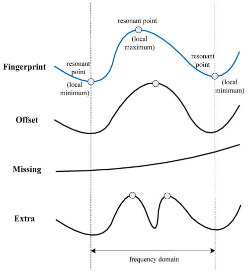 The measured signature and the healthy signature should be compared after extracting all resonant points. The resonant points of the healthy signature (fingerprint) are regarded as bases, and then, the corresponding resonant points of the measured signatures are compared on a case-by-case basis. Each IRFV is obtained based on the following definition and expression. Figure 5 shows three typical situations of resonant point variation in the “frequency domain”, including an offset resonant point, missing resonant point and extra resonant point. Here, the “frequency domain” of the analyzed resonant point, is defined as the frequency range constructed by its neighboring two resonant points in the fingerprint. Figure 5 shows the case of a local maximum resonant point to be analyzed. “Offset resonant point” indicates that there exists one local maximum resonant point on the measured IFRA signature within the “frequency domain”; “missing resonant point” implies that there is no local maximum resonant point on the measured signature within the “frequency domain”; and “extra extreme point” means that there is more than one local maximum resonant point within the “frequency domain”.