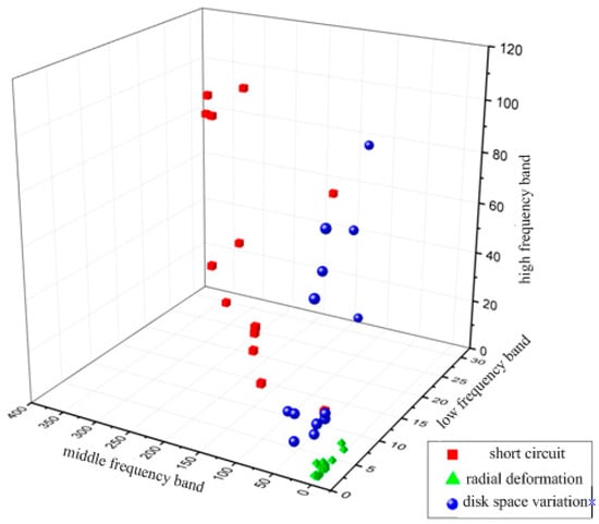 According to the diversity of morphological characteristics for online IFRA signatures in different frequency ranges, the signature can be divided into the low, medium and high frequency band for a more accurate discrimination result. All IFRA signatures, obtained from 46 groups of experiment in Section 3, are processed. For each fault status, the IMSE of healthy and measured signatures in sub-frequency range are calculated, respectively. Namely, the IMSEl, IMSEm and IMSEh are derived. These indicators are plotted in a three-dimensional graph, as shown in Figure 6. The three axis of graph represent the value of IMSEl, IMSEm and IMSEh, respectively. It is concluded from Figure 6 that the distribution of IMSE which corresponds to the RD fault is gathered, while the distributions of IMSE which correspond to the inter-disk SC and DSV fault are dispersed. The reason is that when the interval of fault extent is large for simulating these two types of winding fault. However, the distributions of IMSE for inter-disk SC and DSV in 3D graph are apparently different, and both distributions are different from that of RD. Thus, a vector consisting of IMSEl, IMSEm and IMSEh can be used for fault identification, as shown in Expression (7).