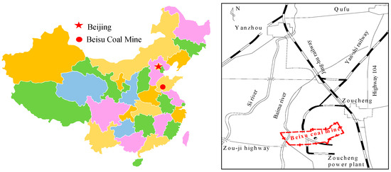 The Beixu coal mine is located in Zoucheng City, Shandong, China, as shown in Figure 1. This mine is a thin coal seam mine; the main recoverable coal seams are the 16U and 17 coal seams, and the thickness of the 16U coal seam ranges from 0.60 m to 1.42 m, with an average thickness of 0.94 m. The thickness of the 17 coal seam ranges from 0.57 m to 1.24 m, with an average thickness of 0.99 m. The recoverable reserves of the 16U coal and 17 coal seams under villages reach 22.682 million tons. This issue restricts the production of coal and affects the economic benefit and safety stability of the coal mine. Therefore, it is urgent to solve the problem of coal mining under the villages in the Beixu mine area. The Beixu Coal Mine is a thin seam mine, so there are many rock tunnels that produce a large quantity of gangue. The transportation of gangue and the environmental pollution of a gangue hill are also very prominent. Using goaf filling technology by pumping gangue slurry to carry out coal mining under the village can not only control the surface subsidence but it can also release the coal under the village. This will greatly ease the situation of coal production difficulties and extend the mining life of the Beixu Coal Mine.