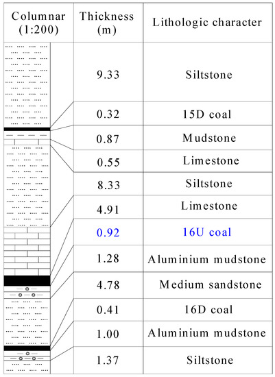 The C1661 working face mines 16U coal, and the thickness of the coal seam is from 0.80 m to 1.01 m, with an average thickness of 0.92 m. The Platts coefficient (f) of the coal seam is 1.25–2.5. The pyrite nodules are locally trapped and the horizon is unstable. The 16U coal is 26.24 m to 40.42 m away from the 15 coal seam, with an average of 33.52 m, and is 8.76 m to 13.37 m away from the 17 coal seam, with an average of 11.07 m. The direct roof of coal seam is limestone with an average thickness of 4.91 m; the coal seam floor is aluminum mudstone, which is easy to expand. Figure 2 shows the stratigraphic column with the lithologic characters of the C1661 working face.