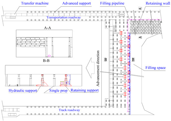 The inclined longwall blasting mining method is adopted in the C1661 working face, and the working face is supported by single props, namely, “π” type steel beams, retaining supports and small hydraulic supports. The filling method is adopted in the roof management of the gob. The mixed filling material is transported to the filling face by the filling pump through the pipeline. A schematic diagram of the mining method in the backfill mining working face is shown in Figure 3.