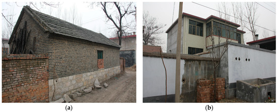 Buildings in the villages: (a) Northern rural wooden structure houses; (b) Brick-concrete structure building.