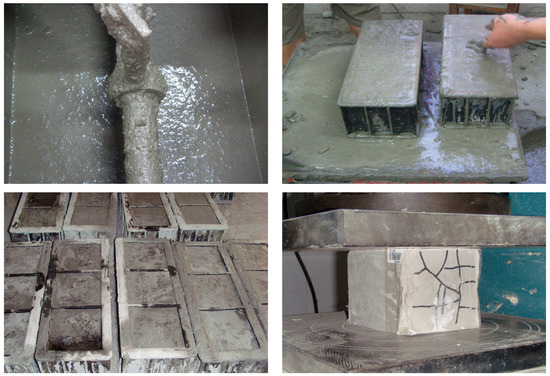 The gangue filling material suitable for pumping pipeline transportation in a coal mine should exhibit very good flow performance, smoothly flow through the pipeline [22] and meet the strength requirements of the gangue filling body in both the early and late stages [23]. To ensure the proper slump of filling material, the ratio of water to fly ash is 1:1, and the proper amount of gangue and cement is studied in the filling material performance experiment. According to the experimental results, the slumps of the filling material are 0 mm, 0 mm, 90 mm and 210 mm, when the ratios of water, fly ash and gangue are 1:1:10, 1:1:8, 1:1:6 and 1:1:4, respectively. Therefore, the final experimental ratio of water, fly ash and gangue is 1:1:4. To study the influence of cement on the strength of the gangue filling materials, cement is added on the basis of the benchmark ratio. The contents of the cement are 0%, 5%, 10% and 20% (the proportion of fly ash content). The experimental process is shown in Figure 5, which mainly includes material stirring, specimen pouring, specimen curing and uniaxial compression testing. The amount of materials and the test results are shown in Table 3.
