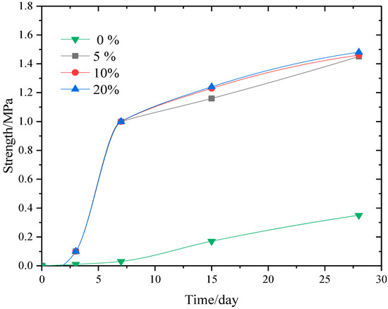 The test results show that when the filling material does not include cement, the gangue filling material is formed after 24 h but is not completely condensed and is soft as time progresses. Additionally, the coal gangue filling material gradually hardens, but until the fifteenth day, is still not completely solidified and does not exhibit pressure test conditions, and its strength cannot be measured. Its 28-day compressive strength is only 0.35 MPa. It can be seen from the experiments that cement facilitates the increase in the strength of the filling material. When cement is added to the filler, the filling material has formed better after 24 h and completely condenses as time goes on; the strength of the filling material with cement increased faster than without cement and has pressure bearing capacity on the second day. The 28-day compressive strengths are 0.35 MPa, 1.45 MPa, 1.46 MPa and 1.48 MPa when the contents of the cement are 0%, 5%, 10% and 20%, respectively. As the cement increases, the strength of the filling material increases, as shown in Figure 6. However, when the cement content is more than 5%, the increase in the strength of the filling material is not obvious. Generally, when cement is added, the filling material can have a certain strength in the early stage, which is very favorable for supporting the roof of the gob as soon as possible; considering economic factors, the 5% content of the cement is more appropriate.