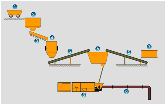 According to the characteristics of the large excavation quantity of rock roadway of the Beixu coal mine, the gangue transportation, storage and crushing system of the backfill mining technology were designed. The mixing of the gangue paste filling material and long-distance pipeline pumping system were developed, as shown in Figure 7. The gangue produced in the driving face is loaded into the tramcar and then transported to the dump chamber of the West Lane through the main roadway of district rise, district dip and district station. At the dump chamber, the gangue is turned into a small gangue bunker and then transported to the gangue crusher by a scraper conveyor. When filling the mined-out area, the broken gangue is transported to the mixer by belt conveyor, then, broken gangue, fly ash, cement and water are mixed together. Finally, the mixed filling material is transported to the filling face by the filling pump through the pipeline.