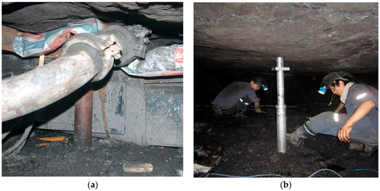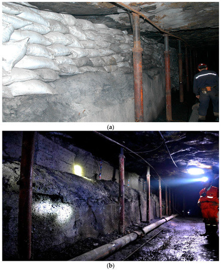 Photos of gob-side entry retaining: (a) Gob-side entry retaining with a bagged gangue wall; (b) Gob-side entry retaining with filling material.