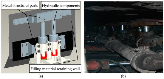 The retaining support is a kind of two pillar support that mainly consists of metal structural parts, hydraulic components and a filling material retaining wall, as shown in Figure 9. The support can adapt to the coal seam thickness of 750–1100 mm, effectively support the roof and retain the filling material. The support has a long cycle life. The gangue retaining wall has the advantages of strong deformation resistance, light weight and good durability. The support is a high reliability retaining support that meets the needs of thin coal seam filling mining technology.