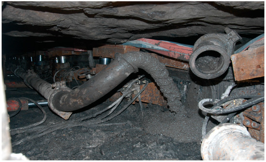 The length of longwall mining face is usually more than 100 m, and the flow range of the filling slurry is limited. Filling from only one site cannot fill the gob, so it needs to be divided into many parts, and the length of each part is approximately 10 m. When a part is completed, the next part will carry out the connection and disconnection of the filling pipeline, as this necessary auxiliary procedure greatly influences the filling efficiency. Especially in thin seam filling mining, this procedure is extremely difficult because the operation space is narrow and because the conveying pipeline is heavy, as shown in Figure 10. Therefore, this procedure will become key to the efficiency of thin seam filling mining. To solve this problem, a “Y” type two-way selection cut-off gate was developed in this paper.