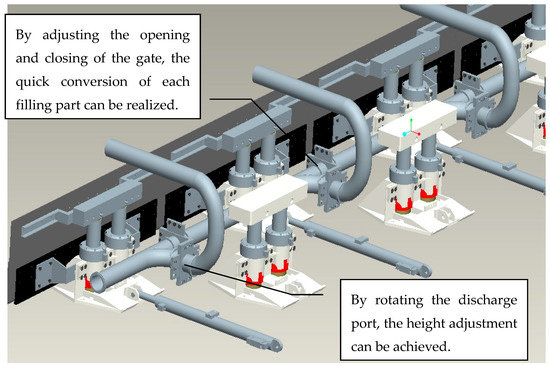 The cut-off gate is mainly composed of a standard flange, steel pipe and flashboard. The gate is connected to the feeding inlet of the main road, discharge outlet of the main road and branch pipe outlet, as shown in Figure 11. The gate valve has a compact structure with a length of 500 mm and a height of 360 mm. By adjusting the opening and closing of the gate, the quick conversion of each filling part can be realized effectively. By loosening the pipe and rotating the discharge port, the height adjustment can be achieved. The cut-off gate has good adaptability to the working face of thin coal seam below a 1.0 m.