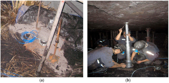 Pictures of the site equipment installation: (a) a stress sensor and (b) a displacement sensor.