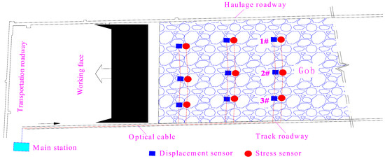 The gob cannot be entered for observation after filling, so the observation instrument adopts special sensors that can automatically monitor and transmit signals through the line. The stress monitoring instrument is a GYW25 digital stress sensor (Uroica Precision Information Engineering Co., Ltd, Taian, China), and the roof subsidence monitoring instrument is a KBU101-200 displacement sensor (Uroica Precision Information Engineering Co., Ltd, Taian, China). The flow of the filling during the filling process can cause the observation instrument to lose its stability and affect normal monitoring of the data, so the instrument is fixed by an anchor bolt during the installation process, as shown in Figure 13. To avoid the crushing of the sensor communication cable, the cable is set into a one-inch steel pipe and connected to the main station of the C1661 track roadway. The stations are arranged in the gob. Each station has three sets of measuring points located at the top, middle and lower parts of the working face, as shown in Figure 14.