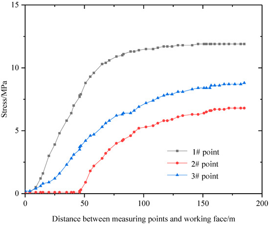 The values of stress acting on the filling body measured by the stress sensors are shown in Figure 15. The results show that the roof subsidence curve of the three measuring points basically exhibited the same change trend. First, with the advancement of the working face, the stress rapidly increased; next, when the distance between measuring points and working face was approximately 100 m, the stresses at the 1#, 2# and 3# points were 11.5 MPa, 5.6 MPa and 7.6 MPa, respectively. Then, the rate of the stress increase became slower. Finally, when the distance between measuring points and working face was more than 150 m, the stress tended to be stable; the final stresses at the 1#, 2# and 3# points were 11.9 MPa, 6.8 MPa and 8.8 MPa, respectively. The monitoring data at the 2# point remained unchanged during the early stage. The reason was that the filling body failed to touch the roof, and the stress sensor did not bear the pressure from the roof. When the distance between measuring points and working face was 46 m, the filling body touched the roof, and the stress sensor began to bear the pressure from the roof. Then, the 2# point began to enter a normal working state, which correctly reflects the roof movement law.