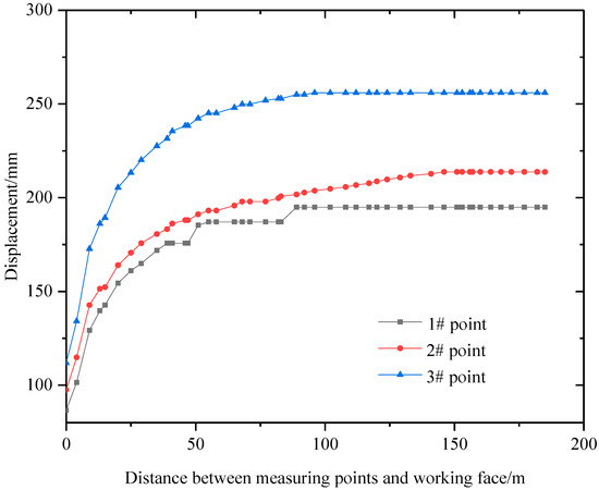 The values of roof subsidence measured by the displacement sensors are shown in Figure 16. It can be seen that the roof subsidence curve of the three measuring points exhibits the same change trend. First, with the advancement of the working face, the roof subsidence rapidly increased. Next, when the distance between measuring points and working face was 50 m, the roof subsidence rates at the 1#, 2# and 3# points were 185.3 mm, 191.1 mm and 242.3 mm, respectively; then, the roof subsidence rate became slow. When the distance between measuring points and working face was more than 100 m, roof subsidence tended to be stable; the final roof subsidence rates at the 1#, 2# and 3# points were 194.9 mm, 213.7 mm and 255.9 mm, respectively.