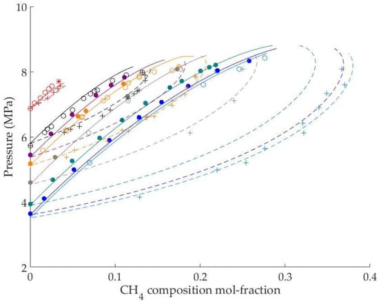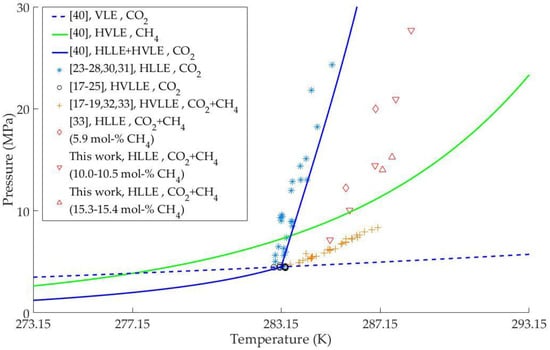The CH4-CO2-H2O ternary system has been studied under multiple phase equilibrium. Al Ghafri et al. [] did a very interesting study of this mixture at VLE, vapor-liquid-liquid equilibrium (VLLE), liquid-liquid equilibrium (LLE), and hydrate-vapor-liquid-liquid equilibrium (HVLLE). Indeed, in the p–T diagram, the VLLE region delimited by the Quadruple curve, the upper-critical end point (UCEP) curve, and the CO2 vaporization curve has been studied by Al Ghafri et al. [], with composition measurements for all phases.