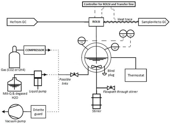 The phase equilibrium experiments were performed with the apparatus described by Ruffine et al. [], which was modified to accommodate a high-pressure stirrer (minimaster, Premex Reactor AG, Lengnau, Switzerland) (Figure 2). It consists of a cylindrical 316Ti variable-volume high-pressure cell with a 17-4PH stainless steel moving piston (Hand-Operated Pressure Generator with optical cell, SITEC-Sieber Engineering AG, Maur, Switzerland). The cell can be operated at pressures up to 60 MPa, and temperatures ranging between 253 and 473 K. The volume of the cell varies from 20.8 (±0.6) to 65.4 (±0.3) mL. Both ends of the cell are closed by a sapphire window. At the top of the cell, a ROLSITM sampler (Rapid On-Line Sampler-Injector, Armines-CTP/MINES ParisTech, Fontainebleau, France) [] was connected to a TCD-FID (Thermal Conductivity Detector-Flame Ionization Detector)-coupled GC-MS (Gas Chromatography-Mass Spectrometry) (7890A-5975C, Agilent, Santa Clara, CA, USA), allowing the withdrawal of an aliquot of a selected phase for compositional analysis. The GC-MS data were processed with the MSDChem software and the Chemstation integrator (Agilent, Santa Clara, CA, USA). To avoid condensation or partial vaporization of the sample, both the ROLSITM and the transfer line were heated up to 423 K with a thermal resistance controlled by a West 6100+ interface (ISE Inc., Cleveland, OH, USA). A high-pressure stirrer was connected at the bottom port of the cell to improve the mixing and shorten the time needed to achieve thermodynamic equilibrium. The stirrer speed, set by a 24 V/DC motor, could be varied between 200 and 1500 rpm. A high-pressure metering pump (Optos, Eldex Laboratories Inc., Napa, CA, USA) was used to inject liquids into the cell at pressures of up to 52.5 MPa with an adjustable flow rate of 0.1–10.0 mL min−1. The thermal regulation was achieved using a compact cooling circulator (ministat 230, Huber Kältemaschinenbau AG, Offenburg, Germany) filled with a mixture of H2O/EtOH (50/50 vol %).