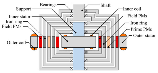 - Sun, L.; Cheng, M.; Hongyun, J. Analysis of a novel magnetic-geared dual-rotor motor with complementary structure. IEEE Trans. Ind. Electron. 2015, 62, 6737–6747. [Google Scholar] [CrossRef]
