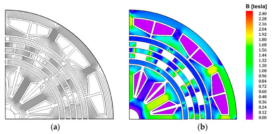 Magnetic flux plot of the generator quarter section by 2D FEM on load: (a) Magnetic flux lines distribution; (b) Magnetic flux density distribution.