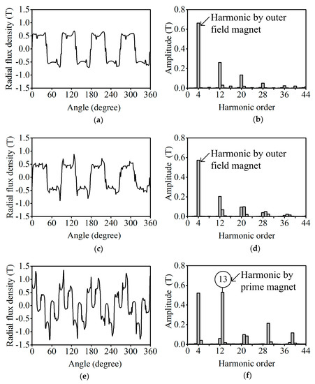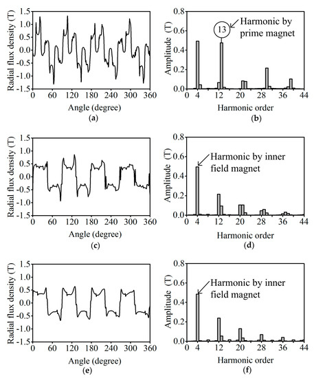 A magnetic flux plot of the magnetic geared generator by 2D finite element analysis is shown in Figure 3 where it is observed that the flux lines are concentrated more at the back iron of the outer stator and tooth of the inner stator. Although this enables flux linkage between the magnetic gear and generator in the magnetically coupled configuration, it could result to high cogging torque on both outer and inner field PM rotors. The flux density characteristics in the outer and inner airgaps of the magnetic geared generator are shown in Figure 4 and Figure 5, respectively. It can be observed that the main harmonics of 4 and 13 in Figure 4b,f, are equal to the number of PM pole-pair numbers for the field and prime PMs.